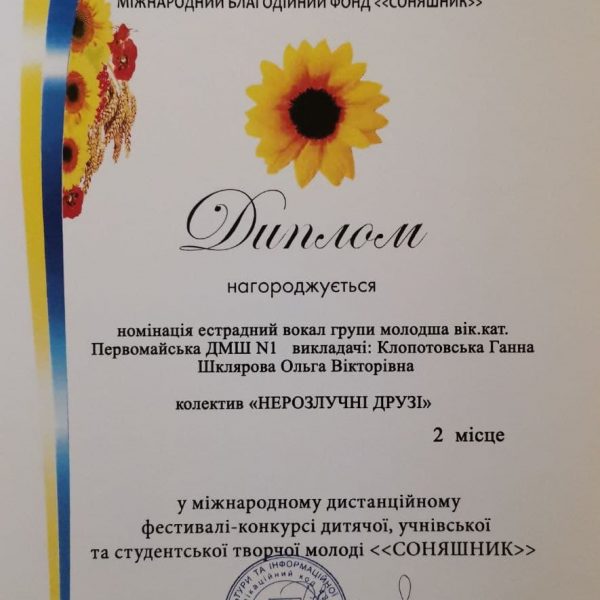 Вітаємо Марунич Діану та викладача Клопотовську Ганну Михайлівну з престижним 2 місцем на Міжнародному фестивалі — конкурсі «Golden Fest»